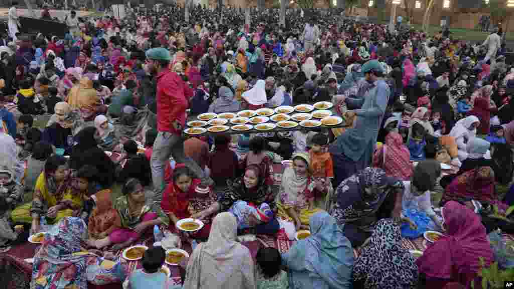 মুসলমানদের পবিত্র রমজান মাসে রোজা ভাঙার আগে পাকিস্তানিরা ১৩ মার্চ বুধবার করাচিতে একটি দাতব্য গোষ্ঠী পরিচালিত বিনামূল্যে খাবার বিতরণ কেন্দ্রে প্রার্থনা করে।