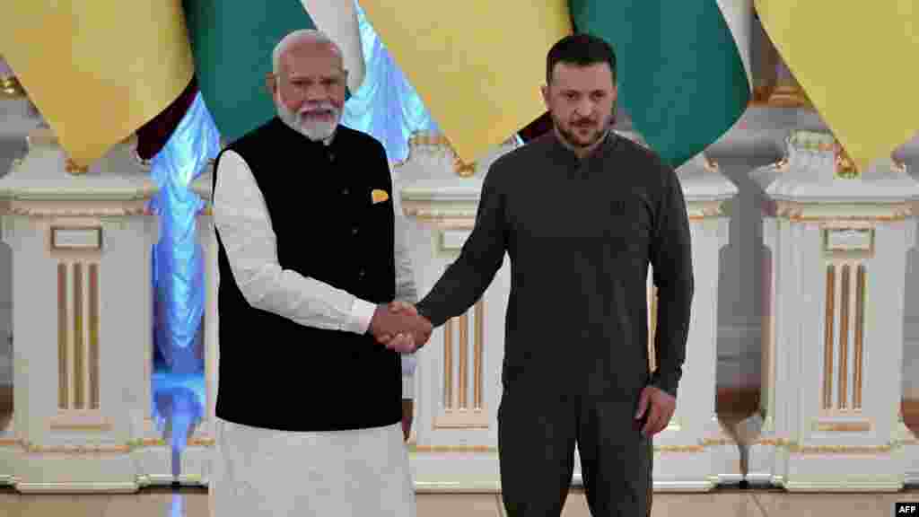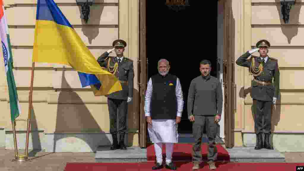 ইউক্রেনের জাতীয় পতাকা দিবসে দেশটিতে সফরে আসেন ভারতের প্রধান মন্ত্রী নরেন্দ্র মোদী। জেলেন্সকি মোদীকে রাষ্ট্রপতির প্রাসাদে স্বাগত জানান।
