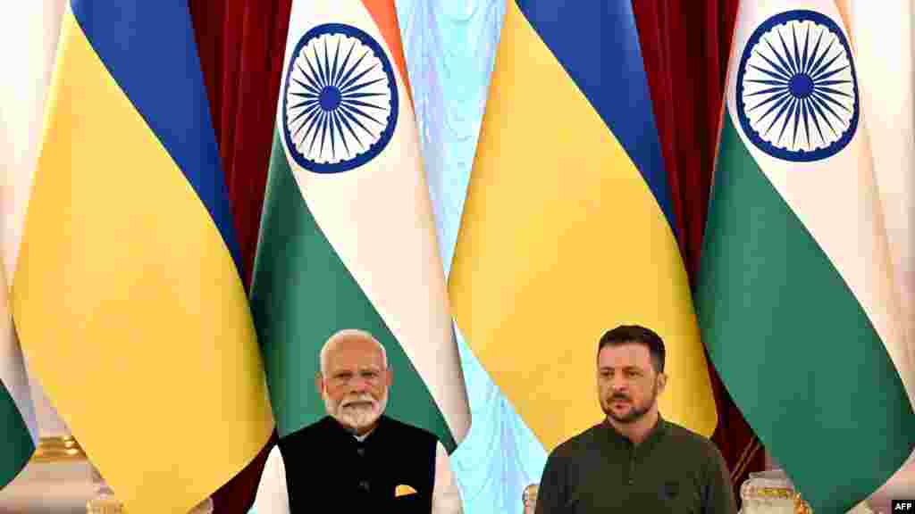 ইউক্রেনের জাতীয় পতাকা দিবসে দেশটিতে সফরে আসেন ভারতের প্রধান মন্ত্রী নরেন্দ্র মোদী। জেলেন্সকি মোদীকে রাষ্ট্রপতির প্রাসাদে স্বাগত জানান।