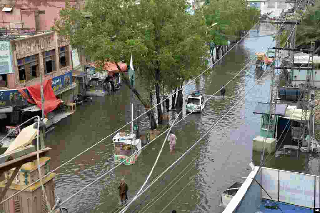 পাকিস্তানের হায়দ্রাবাদে, ভারী বৃষ্টির কারণে সৃষ্ট বন্যায় প্লাবিত রাস্তা দিয়ে মানুষকে হেঁটে যেতে দেখা যাচ্ছে। শুক্রবার,৩০ আগস্ট, ২০২৪। এপি