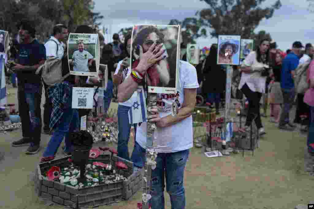 সেই ঘটনার এক বছর পূর্তি উপলক্ষে, দক্ষিণ ইসরায়েলের কিবুতজ রেইমের কাছে অবস্থিত এই জায়গাটিতে লোকজন সমবেত হয়। এই ফটো গ্যালারিতে সেই দিন থেকে নিহতদের প্রতিকৃতি সহ একটি ম্যুরাল এবং পোড়া গাড়ির স্তূপও দেখা যাচ্ছে। সোমবার, ৭ অক্টোবর, ২০২৪।