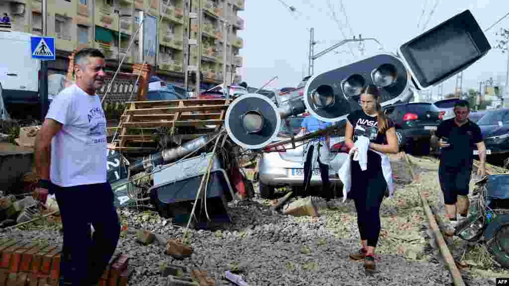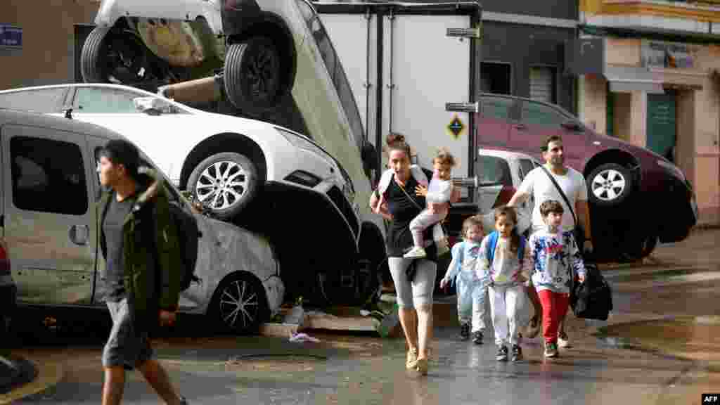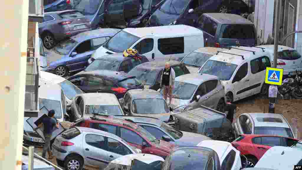 ৩০ অক্টোবর বুধবার স্পেনের পূর্বাঞ্চলে ভয়াবহ বন্যার পর গাড়িগুলোকে একটি অপরটির ওপর স্তূপ করে রাখা হয়েছে।