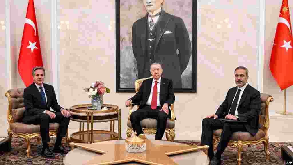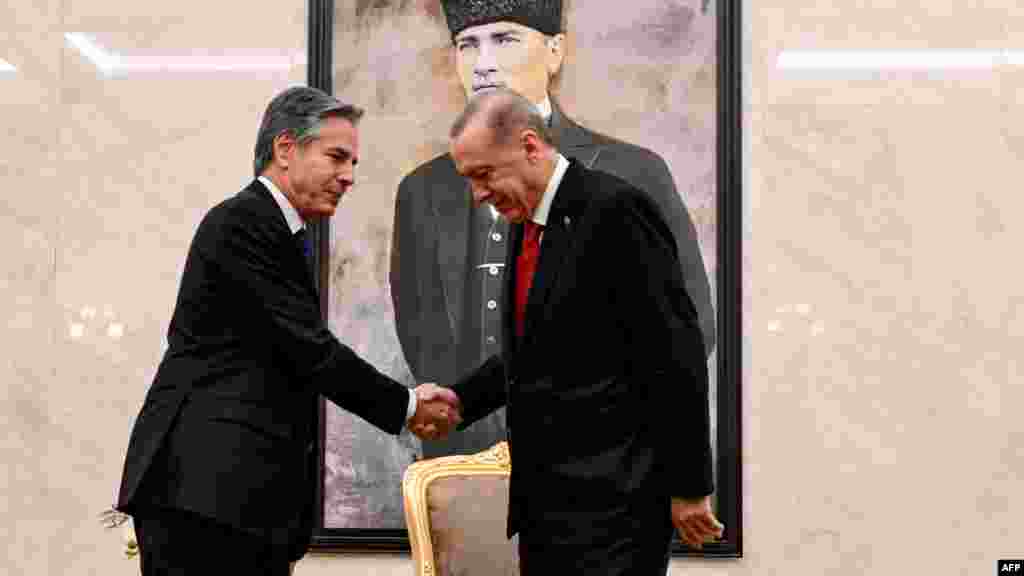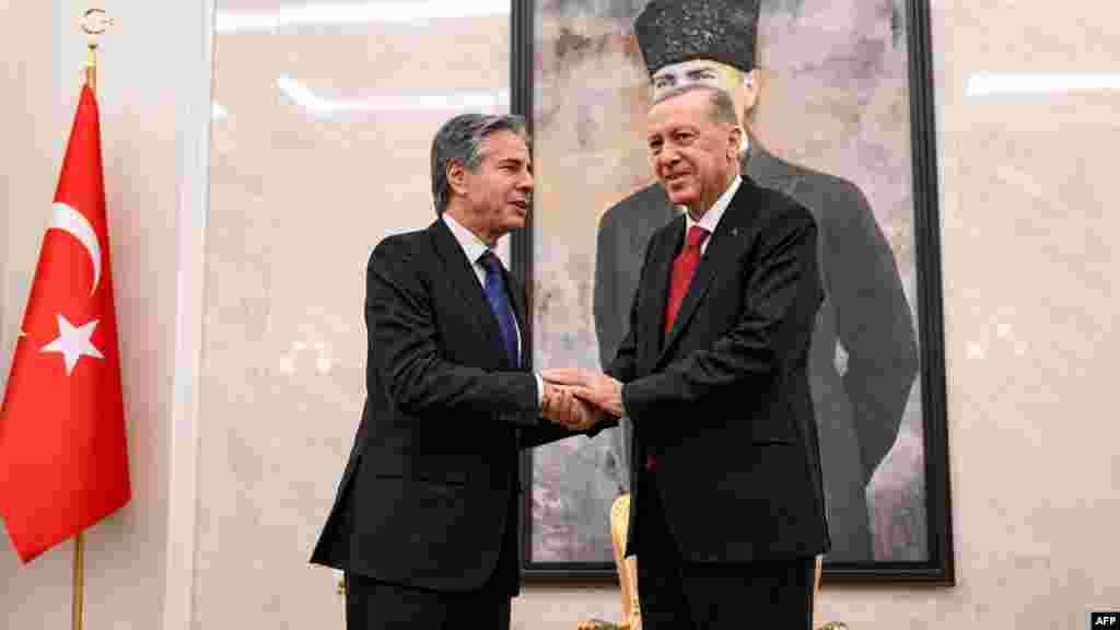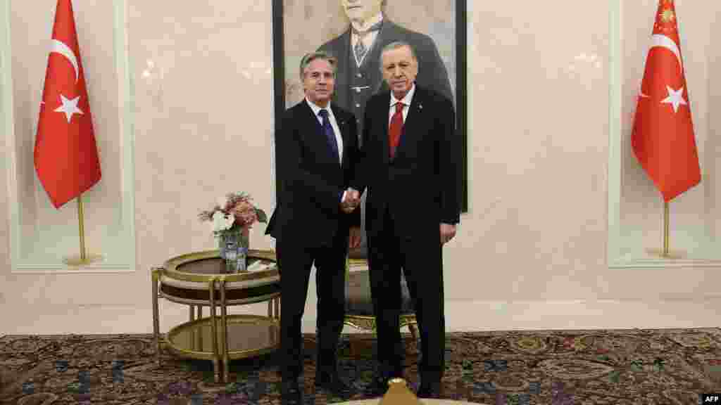 তুরস্কের প্রেসিডেন্ট রেজেপ তাইয়েপ এরদোয়ান যুক্তরাষ্ট্রের পররাষ্ট্রমন্ত্রী অ্যান্টনি ব্লিংকেনের সঙ্গে আঙ্কারায় সাক্ষাৎ করেছেন। বৃহস্পতিবার, ১৩ ডিসেম্বর।